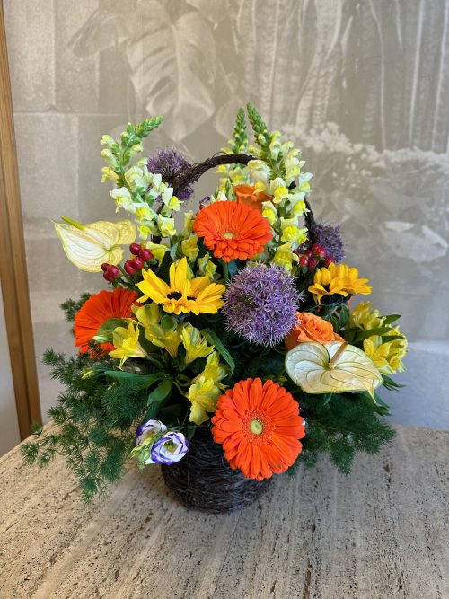 Bouquet solare in armonia di colore. Composto da rose, gerbere, solidago, girasoli e verde decorativo. Ideale per augurare allegria e vivacità.