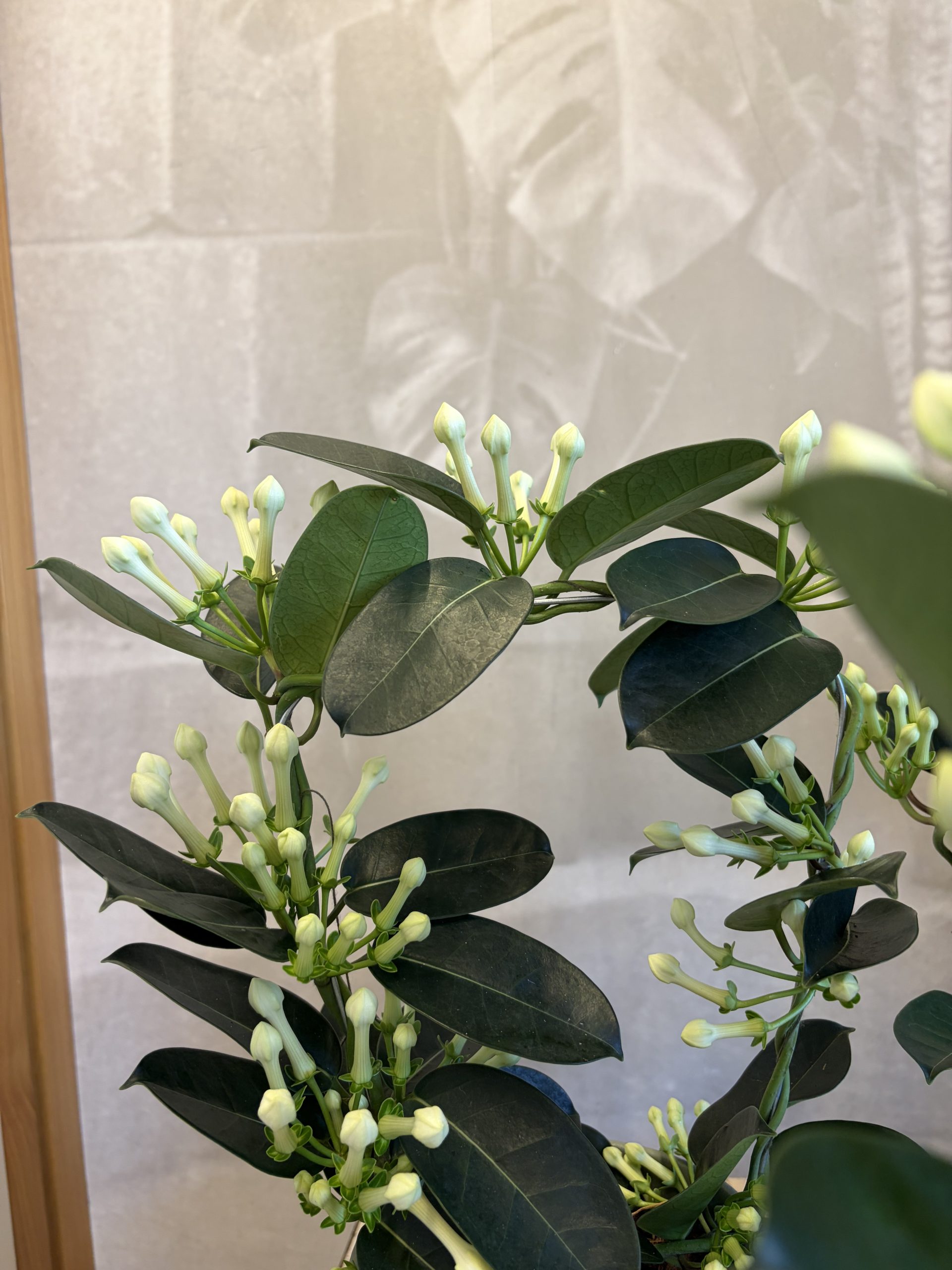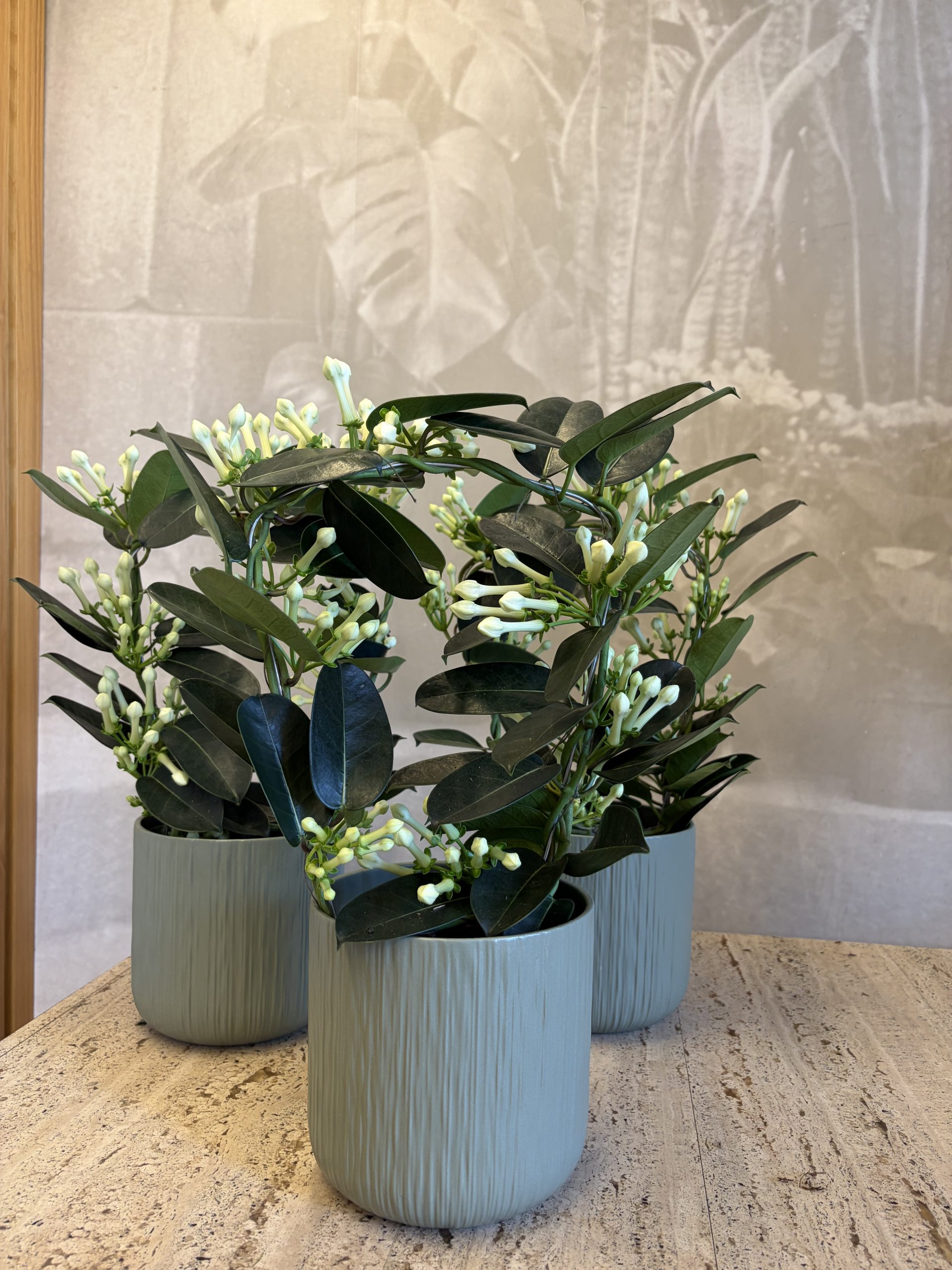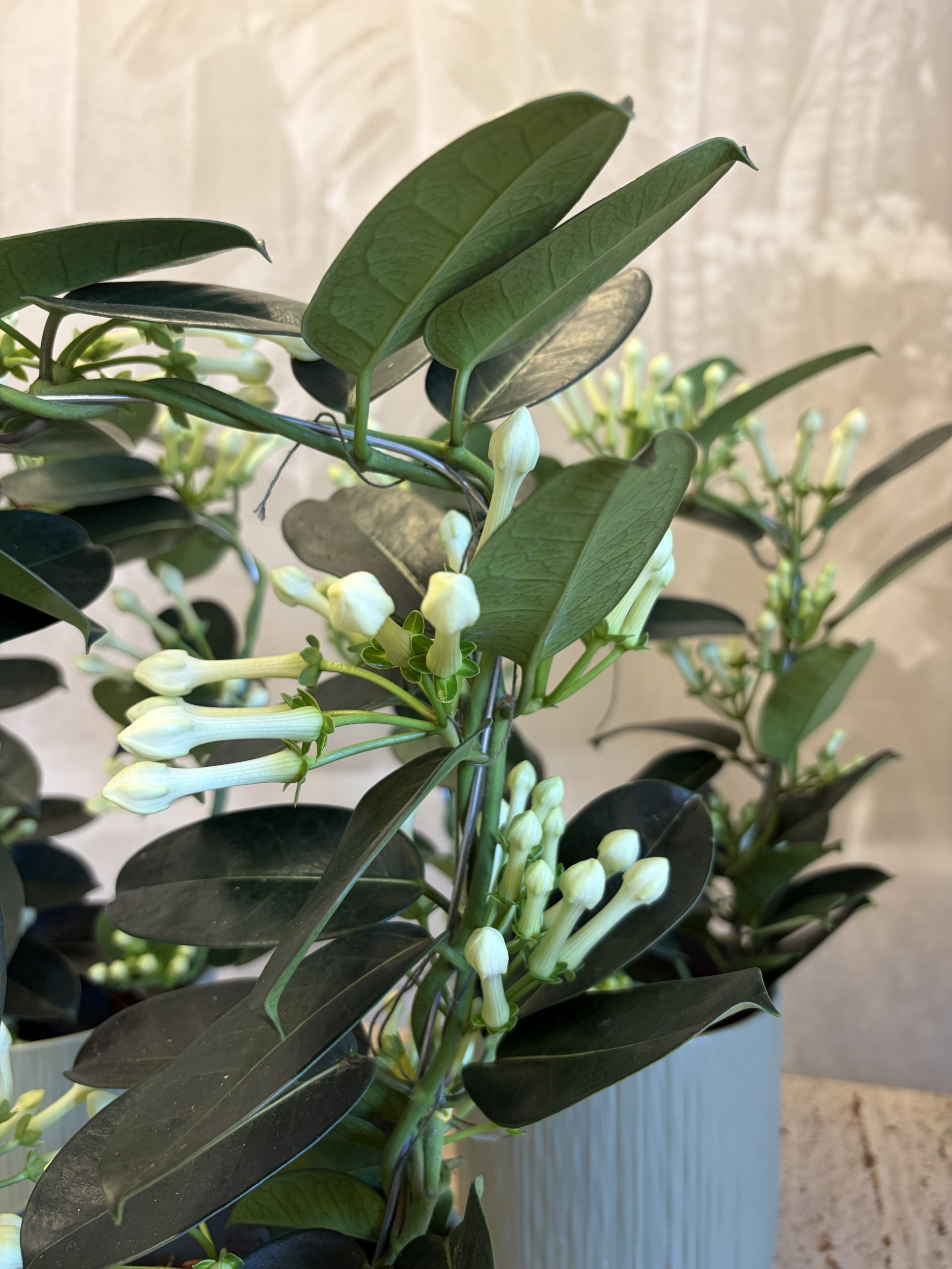 Lo Stephanotis è la scelta perfetta per chi cerca una pianta dal fascino magnetico e dal profumo inebriante. Caratterizzata da foglie curiose di un verde scuro brillante, la pianta è elegantemente intrecciata ad un arco, pronta a ricoprirsi di graziosi fiori bianchi cerosi a forma di stella, noti per la loro fragranza dolce e intensa. Presentato in un moderno vaso di ceramica opaca con texture a righe verticali color verde salvia. Per curarlo al meglio, posizionalo in un ambiente molto luminoso ma lontano dai raggi diretti del sole e dalle correnti d’aria. Predilige annaffiature regolari, mantenendo il terriccio umido ma senza ristagni, e gradisce molto le nebulizzazioni sulle foglie (evitando i fiori) per mantenere l’umidità ambientale necessaria.